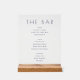 This acrylic sign features a minimalist and elegant design, perfect for any bar or home setting. The layout is centered with ample spacing, creating a balanced and sophisticated look. It showcases a monochromatic color palette of black text on a white background, emphasizing clarity and simplicity. The typography uses a classic serif font, enhancing readability while maintaining a refined aesthetic. Ideal for displaying your beverage options, this sign conveys a professional yet inviting atmosphere.