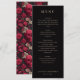 This elegant wedding menu features a classic, vertical layout with a sophisticated black background and crisp white text. The design uses a clean serif font to create a formal and refined atmosphere, with sections clearly marked for starters, salad, main course, and dessert. Each dish is presented in an easy-to-read format, enhancing the overall sense of luxury and simplicity. Perfect for a formal event, this menu exudes elegance and sophistication, making it ideal for couples seeking a timeless and stylish presentation for their special day.