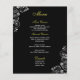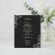 An elegant way to present your wedding menu. A list showing the first course, second courses and dessert options. The reverse has a personal message from you along with your names and wedding date. A dramatic black menu with silver grey swirls and a floral pattern.