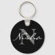 Elegant black and white stylish name monogram keychain. Classy script typography and black background colour. Elegant design for men women and kids. Monogrammed with your name initial letter. Cute birthday gift idea for dad, father, mum, mother, husband, wife, son, daughter etc. Also nice as party favour at chic weddings, reunion, graduation etc. Luxury style.