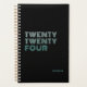 This yearly planner for 2024 features a background in black and large retro typography that was first popular in the 1930s and again in the 1970s, and is designed in graduating light to dark teal green colours. Personalise with your name in a complementary sans serif font also in teal. A large size is also available in my store.