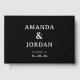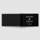 This elegant wedding guest book features a minimalist design with a solid black background and crisp white text, creating a striking contrast. The layout is centred and vertically aligned, emphasizing the clean and modern aesthetic. Utilising a sophisticated serif font for the names and a simple sans-serif for additional details, this design conveys formality and celebration without any decorative motifs, making it perfect for a contemporary wedding event.