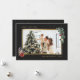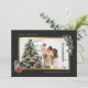 Elegant custom black watercolor photo Christmas cards featuring a black photo frame decorated with watercolor illustrations of poinsettia, a lantern, and a pine tree branch with pine cones and ornaments. Easily personalise these elegant watercolor Christmas photo cards with your image and text.