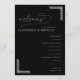 This elegant wedding program features a sophisticated monochromatic design with a deep black background and crisp white text, creating a striking contrast. The layout is centered with ample negative space, emphasizing the content, while decorative corner accents add a touch of sophistication. The typography combines cursive for an inviting welcome message with clean sans-serif fonts for clarity in listing ceremony details. Perfect for a formal event, this design conveys elegance and timelessness, making it ideal for couples seeking a modern yet classic aesthetic for their special day.