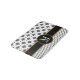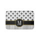 This elegant design features a pattern of black damask and polka dots along with a pattern of thin vertical black stripes on a white background, each on a spacious white background. The two patterns are separated by a classy gold edged black ribbon and a white monogram on a black circle with a perimeter of smaller gold circles. You can personalise this item for yourself for a loved one by changing the monogram initial.