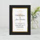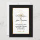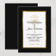 Invite your guests to help you celebrate your special day with this elegant invitation featuring modern script, black and gold text including an artistic palm tree and metallic gold foil frame on the front of the card. A black background is on the front and back.