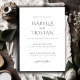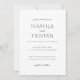 A simple elegant minimalist back and white typography wedding invitation with an elegant, vintage flourished type style. This typeface is inspired by first century Roman inscriptions, offering a balance between a classic feel and a modern aesthetic. The sweeping decorative flourishes on the letters create a sense of drama and elegance.