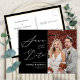 Modern Black and White Elegant Script Photo Simple Wedding Save The Date Announcement Postcard. Let your family, friends and colleagues know that you have set a date for your wedding celebration with this elegant, stylish and modern wedding save the date invitation card. All the texts are pre-arranged for you to personalise easily and quickly with your own details.