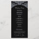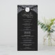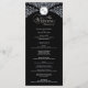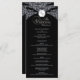 This wedding program features a bold black background framed with ornate white damask flourishes, giving it a formal and timeless style. At the top, a decorative crest displays the initials, while the centre of the design presents the couple’s names and all wedding service details in a clean, organised layout. The contrast of black and white creates a striking look that emphasizes elegance and sophistication, making it a perfect choice for traditional or evening weddings.