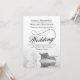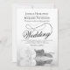 This beautiful wedding invitation features a gorgeous black and white photograph of a single long stemmed white rose lying on its side reflecting in a pool of water with waves and ripples. The design features a fancy calligraphy script with a long curly tail making it both modern and classic. Elegant, sophisticated and chic way to invite your friends and family to share in your special day. The back of the card has a custom note and QR code directing your guests to your wedding website for details and RSVP.