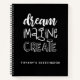 This personalised girly 8.5 x 11 sketchbook has white text on a traditional black background. The words, "DREAM,IMAGINE,CREATE" in a hand drawn font personalised with your name below. Customise the sketchbook with the name of your choice to make someone feel extra special. Makes a fun gift for birthdays or for Christmas. Comes in a variety of colours. Designed for you by Blackberry Boulevard.