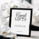 Add a refined touch to your reception décor with this elegant black and white cards and gifts sign. Designed with a deep black background and sophisticated serif paired with graceful script typography, it offers a timeless and polished way to guide your guests. Perfect for modern weddings, black-tie events, or classic evening receptions, this sign complements matching invitations, menus, and bar signage from the Sabrina wedding stationery suite. Fully customisable — personalise names, date, or text to fit your celebration.