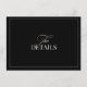 A classic and elegant wedding details card featuring a black background with refined white typography and a delicate border. The front displays “The Details” in timeless script, while the back is fully customizable for accommodations, directions, dress code, and more. Perfect for formal, modern, or black-tie wedding suites.