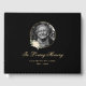 Elegant black floral memorial/funeral photo guest book featuring yellow watercolor roses and baby's breath flowers adorning a gold photo frame against a black background. Easily personalise online.