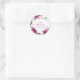 A beautiful save the date sticker featuring an artistic watercolour pink lily floral painting sat behind a white framed panel holding your personalised save the date details set in elegant text. Designed by Thisisnotme©