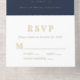 Elegant dark navy blue 60th birthday party all-in-one invitation featuring "Cheers to 60 Years," your name, invitation details and a tear-away RSVP response postcard written in classic serif typography and simple modern lettering, all rendered in your choice of genuine gold, silver or rose gold foil.