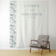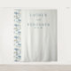 This wedding backdrop features a minimalist design with a clean, elegant aesthetic. The left side showcases a vertical band of abstract tree or mountain shapes in soft blues, greys, and beiges, while the right side remains white for balance. Centred text in a sophisticated serif font adds a formal touch, making it perfect for creating a serene and stylish atmosphere at your special event.