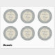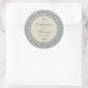 An elegant wedding favour round sticker featuring a blue and beige baroque damask pattern overlaid with a coordinating round inset of two-tone beige stripes. A matching blue text colour completes the design. Personalise the text with your desired text.