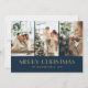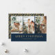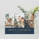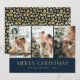 Custom blue and gold photo Christmas card featuring a photo collage on a dark blue background. A gold foil stars background at the back. Easily personalise these photo Christmas cards with your images and text. The gold foil effect is only simulated in the artwork.