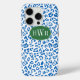 This phone case design features a modern leopard print pattern in classic blue with green accents, including space for a monogram.