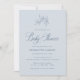 Elegant Blue Baby Shower Invitation. Romantic and timeless, this dusty blue baby shower invitation features vintage line art floral roses that can be used for any season. Add a touch of modern and classic elegance to your special day with these stylish and beautiful invitations. Navy text on a light blue-grey background with a lovely coordinating pattern on the back.