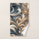 Elegant baroque-inspired swirl design in warm beige, ivory and deep blue tones.