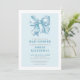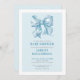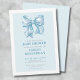 A cute and classic blue bow baby shower theme featuring an adorable baby blue watercolor bow mixed with a light blue background. A mix of grey and blue fonts with both a bold serif typography and a simple modern font. Celebrate the mum to be in style! Available in more colour schemes too. You can change the font colours out to whatever you'd like. You can also change the background colour on the front and back. Blue Bow Baby Shower Invitation.