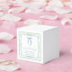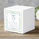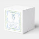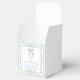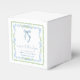 Elegant party favor boxes for your bridal shower featuring green scallop and blue floral watercolor frames, a delicate blue coquette bow watercolor, "a sweet thank you" showcased in an elegant blue calligraphy script, and the name of the bride and shower date in classic serif typography.