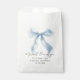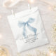 Elegant party favor bags for your bridal shower featuring a blue coquette bow watercolor, "a sweet thank you" in a chic script, and the bride's name and the shower date in classic serif typography.