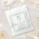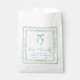 Elegant bridal shower party favor bags featuring grandmillenial-inspired vintage green scallop and blue floral watercolor frames, a delicate blue coquette bow watercolor, "love + thanks" showcased in an elegant blue calligraphy script, and the name of the bride and shower date in classic serif typography.