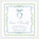 Elegant bridal shower thank you stickers for your party favors and thank you cards featuring grandmillenial-inspired vintage green scallop and blue floral watercolor frames, a delicate blue coquette bow watercolor, "love + thanks" showcased in an elegant blue calligraphy script, and the name of the bride and shower date in classic serif typography.
