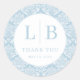 This Classic Round Sticker features a delicate, lace-like border in soft blue, creating an elegant and sophisticated look. The design includes the initials "L B" prominently displayed at the center, surrounded by intricate patterns that add a touch of refinement. Ideal for personalizing gifts or expressing gratitude, this sticker conveys a warm and appreciative tone with its gentle color palette and classic style. Perfect for occasions like weddings, baby showers, or thank-you notes, it adds a charming finish to any package or card.