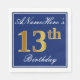 This simple and elegant paper napkin design features a message like "ANameHere’s 13th Birthday" (with the "13th" having a faux gold-like colouring) within a blue-coloured square area featuring a simple border outline. The name is in white-coloured script-like text, and can be personalised. Napkins like these could perhaps be used at a birthday party for somebody who is celebrating their thirteenth birthday. [~Z0000141]