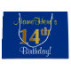 This simple, elegant birthday gift bag design features a personalised message like "NameHere’s 14th Birthday!" (with the "14th" having a faux/imitation gold-like colouring look) on a blue coloured background. The name is in script-like, yellow-coloured text, and can be customised. A personalised birthday gift bag like this could perhaps be used when giving a present or gift to somebody who is celebrating their fourteenth birthday. [~Z0000260]