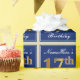 This simple and elegant wrapping paper design features a personalised message like "NameHere’s 17th Birthday" (with the "17th" having a faux/imitation gold-like colouring look) within a blue-coloured square area featuring a simple border outline. The name is in an elegant white-coloured script-like text, and can be customised. Wrapping paper like this could perhaps be used when wrapping birthday gifts for somebody who is celebrating their seventeenth birthday. [~Z0000221]