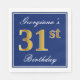 This simple and elegant paper napkin design features a message like "Georgiana’s 31st Birthday" (with the "31st" having a faux gold-like colouring) within a blue-coloured square area featuring a simple border outline. The name is in white-coloured script-like text, and can be personalised. Napkins like these could perhaps be used at a birthday party for somebody who is celebrating their thirty first birthday. [~Z0000141]