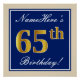 This simple and elegant birthday party poster design features a personalised message like "NameHere’s 65th Birthday!" (with the "65th" having a faux/imitation gold-like colouring look) within a blue-coloured square area featuring a simple border outline. The name is in an elegant white-coloured script-like text, and can be personalised. A personalised birthday party poster like this could perhaps be used as a decoration at a party being held for somebody who is celebrating their sixty fifth birthday. [~Z0000239]