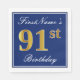 This simple and elegant paper napkin design features a message like "FirstName’s 91st Birthday" (with the "91st" having a faux gold-like colouring) within a blue-coloured square area featuring a simple border outline. The name is in white-coloured script-like text, and can be personalised. Napkins like these could perhaps be used at a birthday party for somebody who is celebrating their ninety first birthday. [~Z0000141]