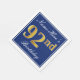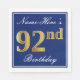 This simple and elegant paper napkin design features a message like "Name-Here’s 92nd Birthday" (with the "92nd" having a faux gold-like colouring) within a blue-coloured square area featuring a simple border outline. The name is in white-coloured script-like text, and can be personalised. Napkins like these could perhaps be used at a birthday party for somebody who is celebrating their ninety second birthday. [~Z0000141]