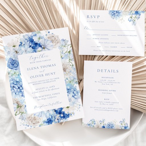 This wedding invitation features a watercolor floral frame with elegant flowers in varying shades of blue and handwritten script font. With its sophisticated flower frame and attention to detail, this invitation will set the tone for a memorable and elegant wedding. Customisable with your choice of gold, silver or rose gold real foil.