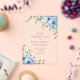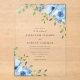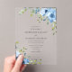 Beautiful blue watercolor flowers and greenery decorate this elegant floral clear acrylic wedding invitation.