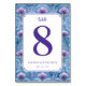 This elegant wedding table card features a luxurious Art Nouveau-inspired design with a rectangular layout and intricate floral motifs in shades of blue and purple. The central white space is bordered by symmetrical, stylized flowers that create a sophisticated atmosphere. A bold numeral "8" stands out prominently, accompanied by cursive and serif typography for a refined touch. Perfect for formal celebrations, this card combines decorative elements with clear text to enhance the mood of sophistication and celebration at your special event.