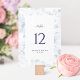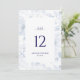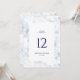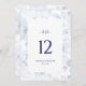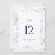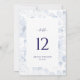 A beautifully designed wedding table number card featuring delicate blue floral illustrations and elegant typography.
