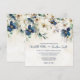 A sophisticated invitation for your winter wedding with elegant navy blue and soft turquoise watercolor flowers with winter greenery and modern handwritten style text.