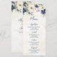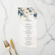 A beautiful menu for your winter wedding table with elegant navy blue and cream watercolor flowers, customizable with your dinner details, available in a wide range of matching wedding products.