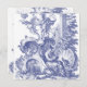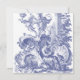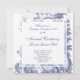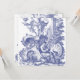 Beautiful blue and white toile pattern featuring a man and a dog with a Roccocco or Late Baroque surround.