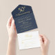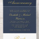 Elevate your 50th wedding anniversary celebration with this elegant dark navy blue all-in-one invitation featuring "50th Anniversary," the names of the couple, and "Rsvp" in a classic calligraphy script, the invitation details in simple lettering, and a white tear-away response postcard providing a convenient RSVP option for your guests. All of the text on the inside is rendered in your choice of genuine gold, silver or rose gold foil for a sophisticated touch.