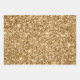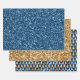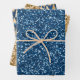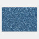 Elegant 3-sheet Christmas holiday wrapping paper collection with a sheet of blue glitter, a sheet of gold glitter, and a sheet with gold Christmas holiday trees patterned onto a metallic blue background.