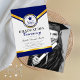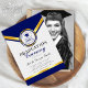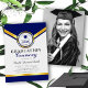 This graduation ceremony invitation design features an elegant formal layout of blue, light grey and gold colours with a blue graduation hat and blue stars. Personalise your own graduation picture in the back of the invitation.