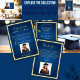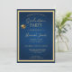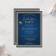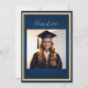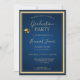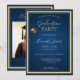 This image is a blue and gold-themed graduation party invitation. It features elegant gold script fonts, a small graduation cap graphic, and includes placeholders for the graduate's name, school, class year, event date, time, location, RSVP details, and a photo on the back. The design has a formal and celebratory tone. Customise for a personal touch!